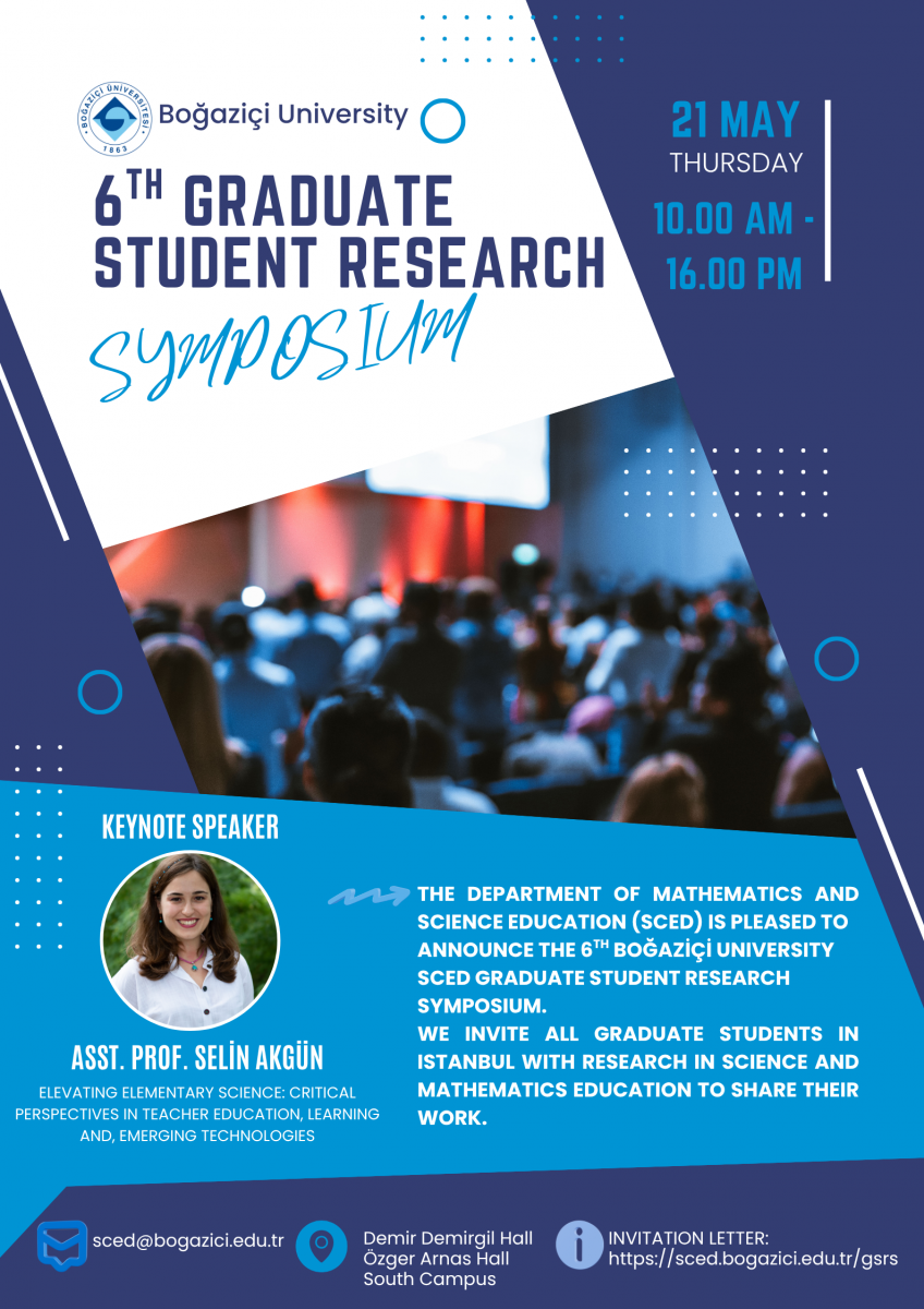 The Department of Mathematics and Science Education (SCED) is pleased to announce the 6th Boğaziçi University SCED Graduate Student Research Symposium. We invite graduate students to participate in a symposium designed to support preparation for international conferences. Participants will present their research in a collegial setting, receive feedback from peers and faculty members, and gain experience in academic communication. The symposium also aims to demonstrate the importance of graduate-level research. Only studies that include empirical data will be accepted; submissions consisting solely of literature reviews or without data collection will not be considered.